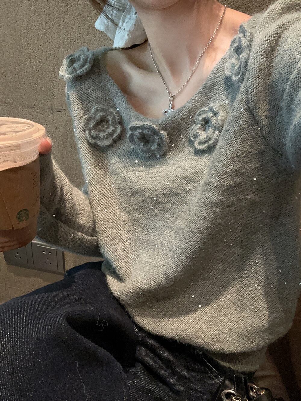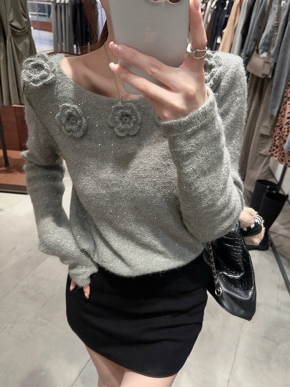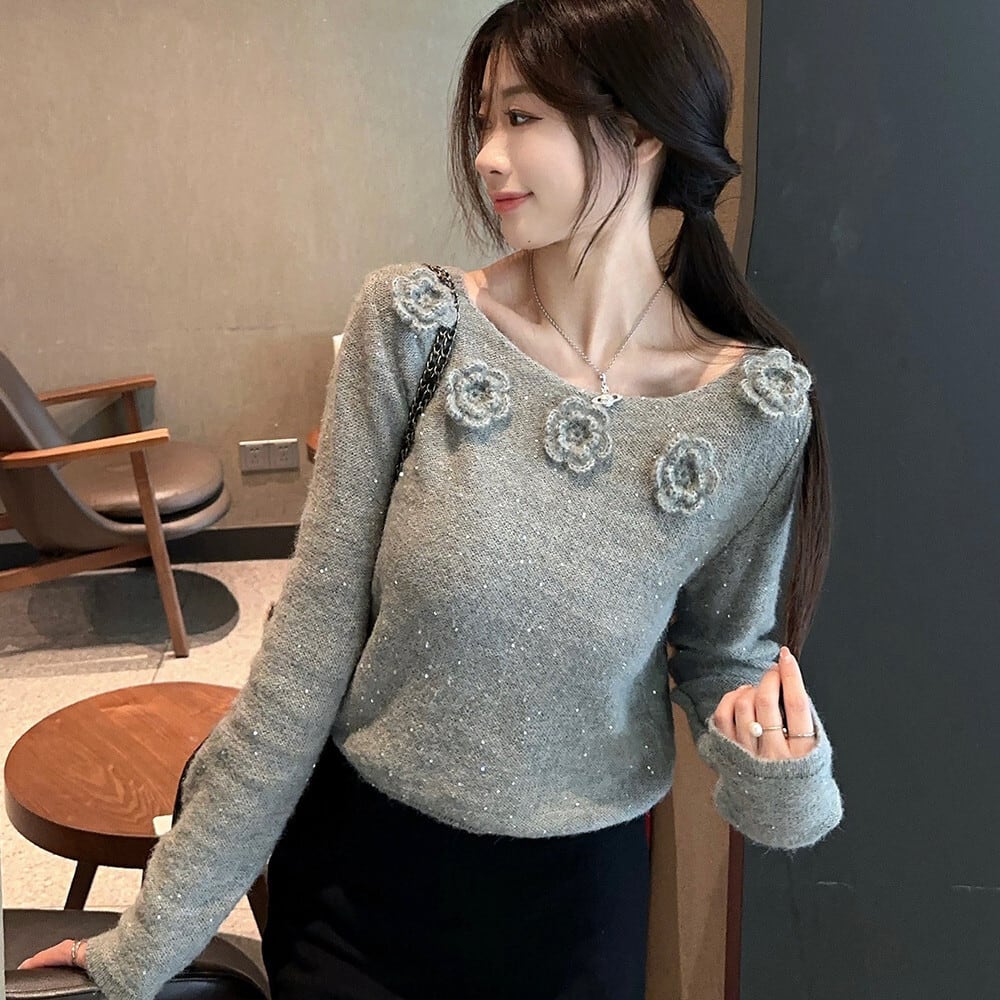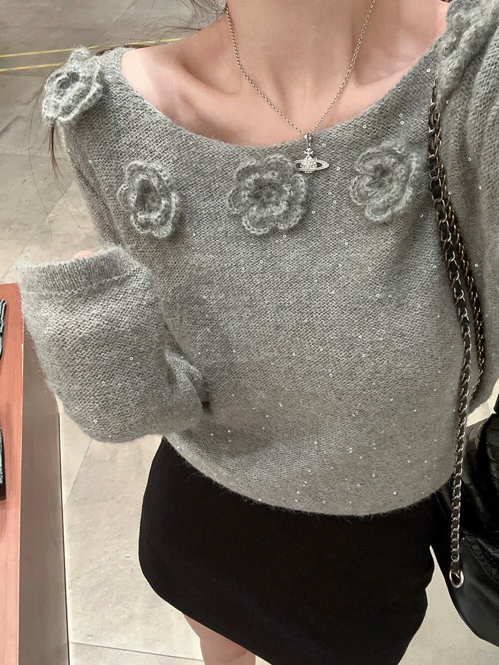 【tops】スパンコール立体フラワーニットトップス M27222