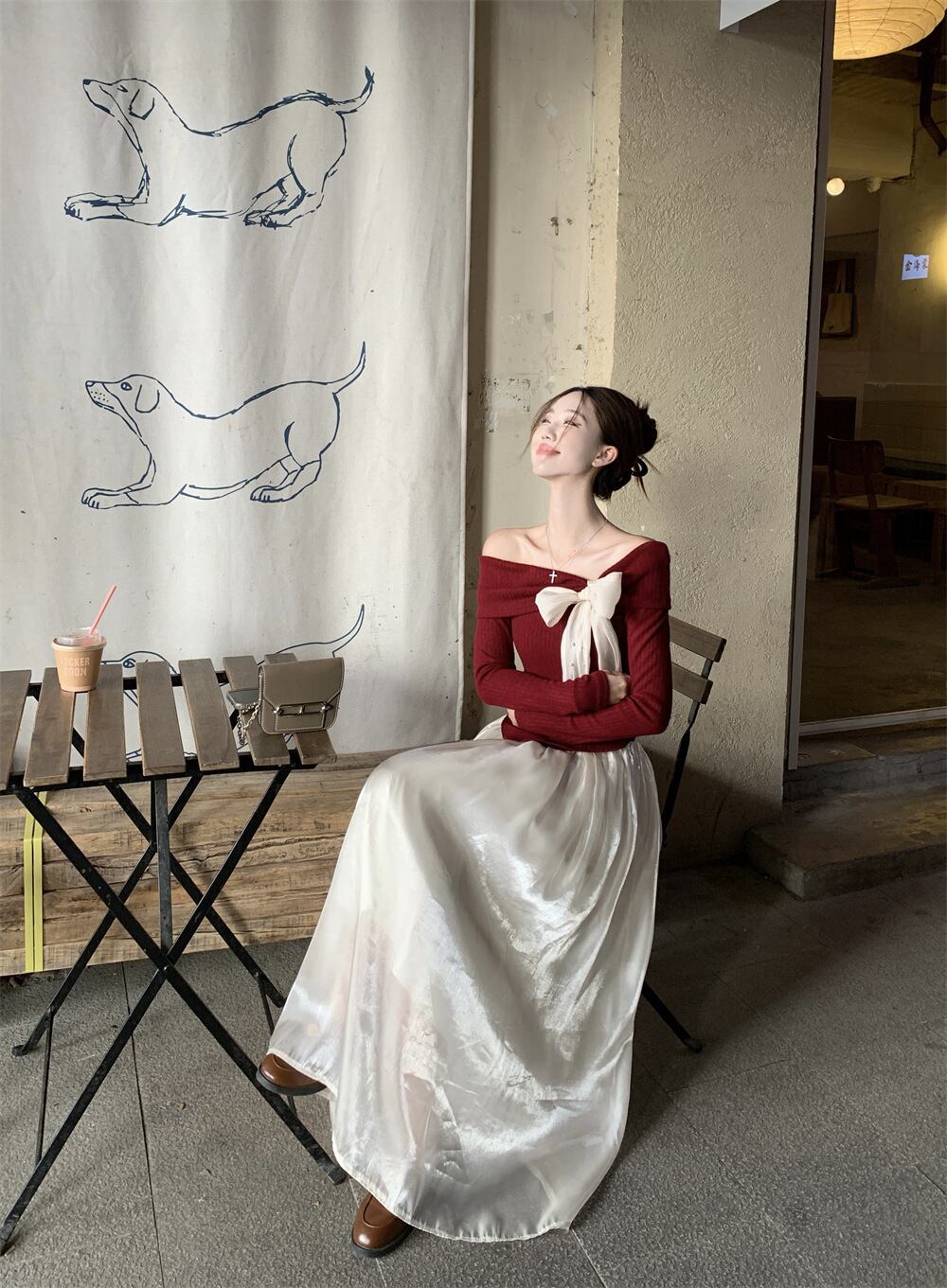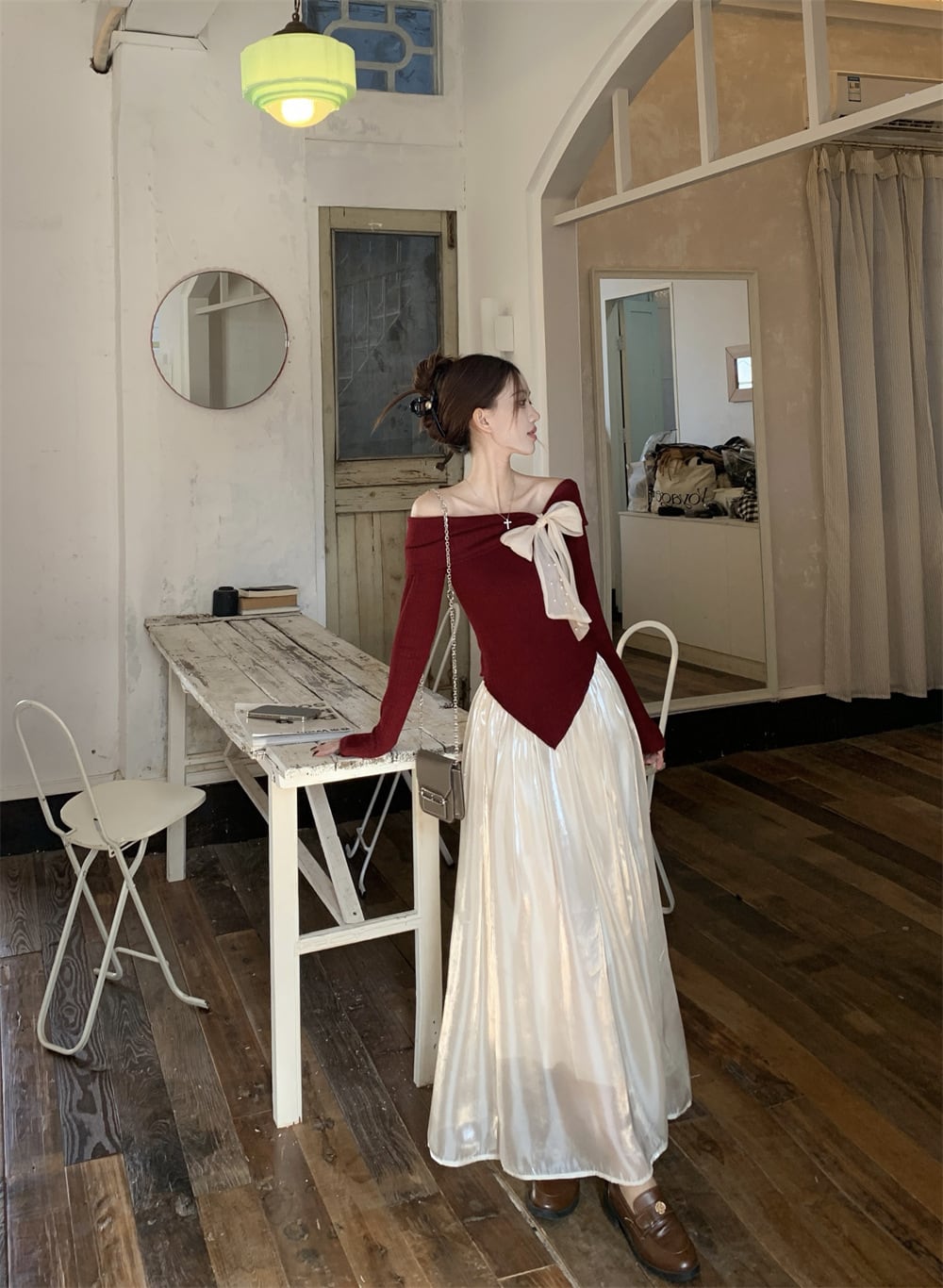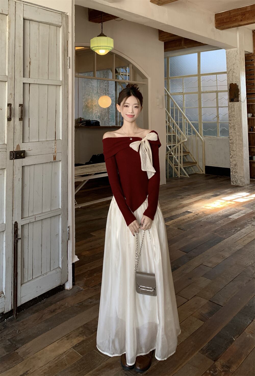 【set】リボン付きボートネックニットトップス×スカートセット M27677
