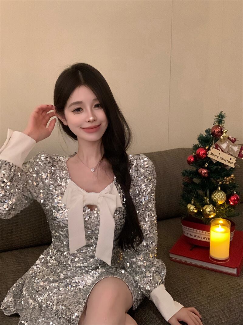 【dress】スパンコールリボン付きワンピース M28003