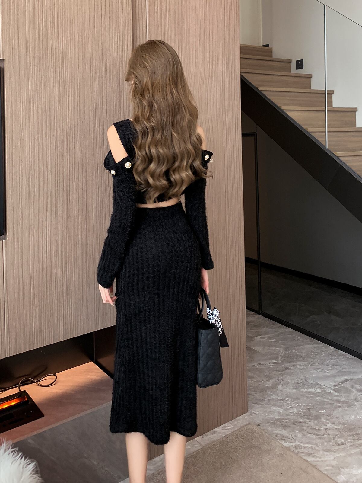 【set】オフショルダーフリンジニットセーター×スカートセット M28137
