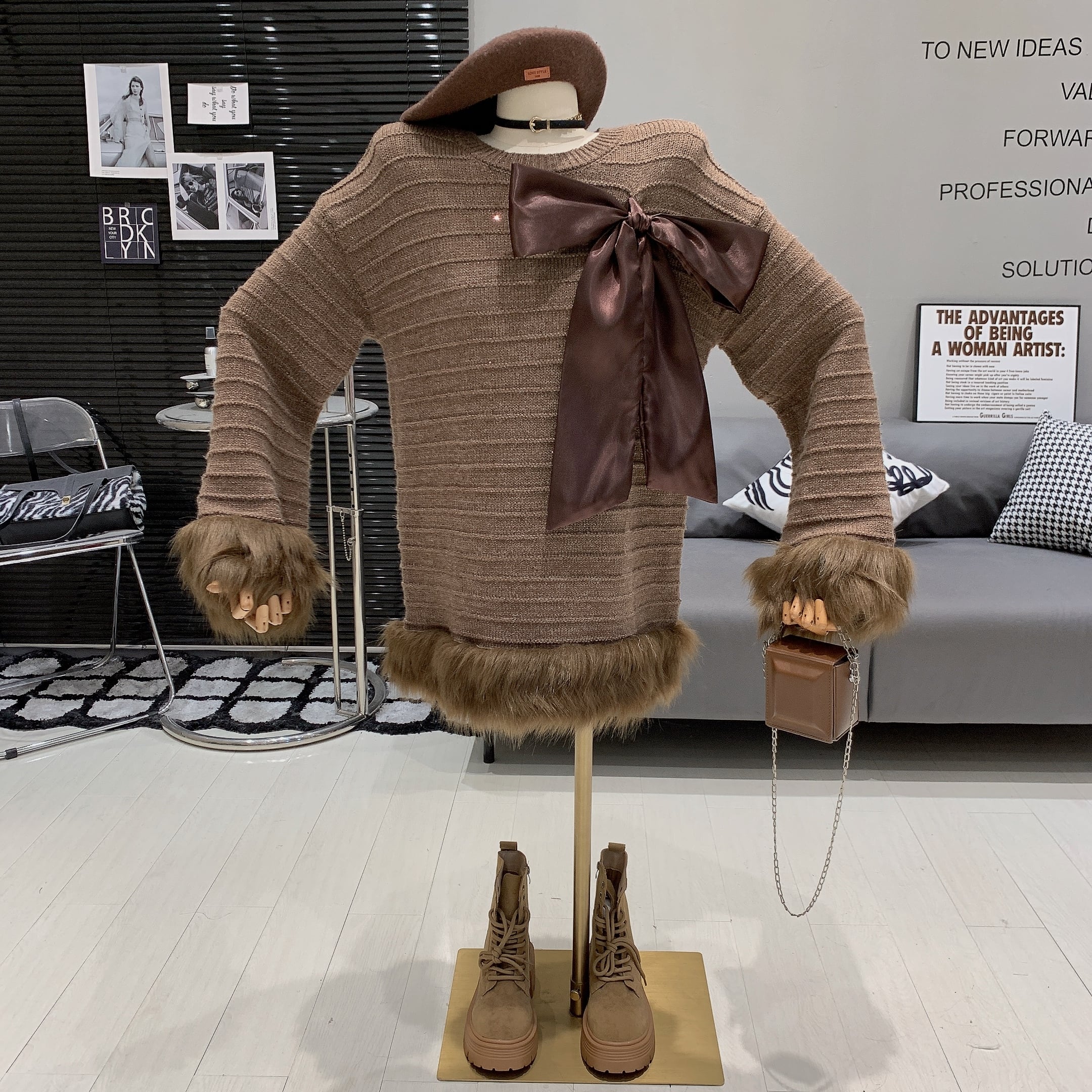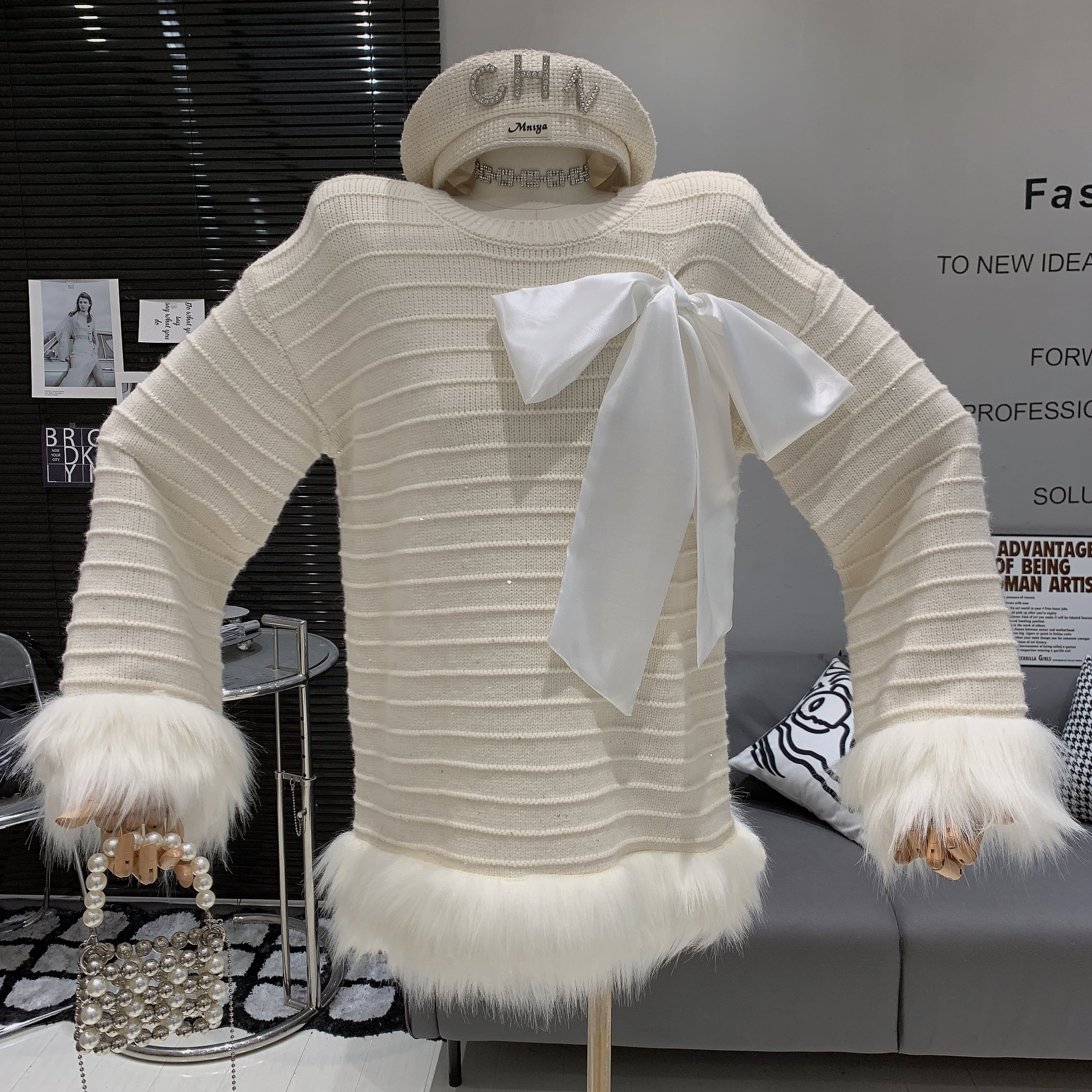 【tops】袖ファーリボン付きニットプルオーバー N2940