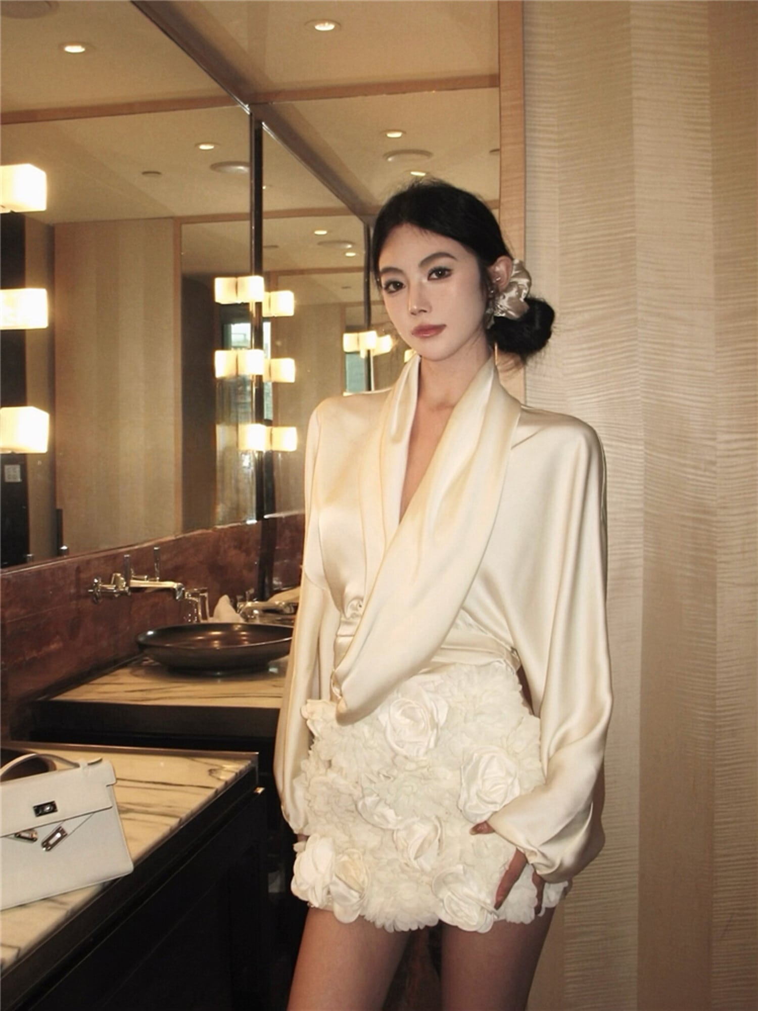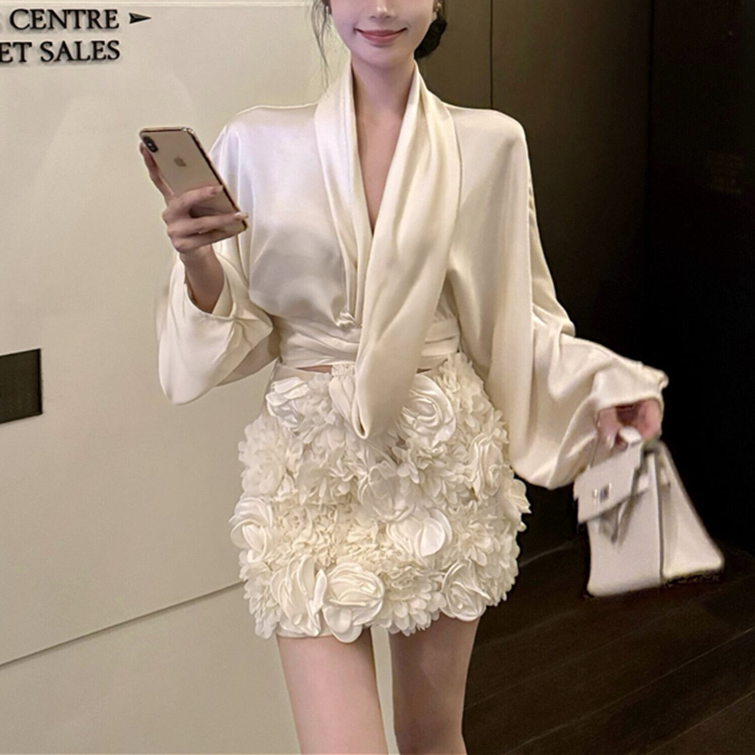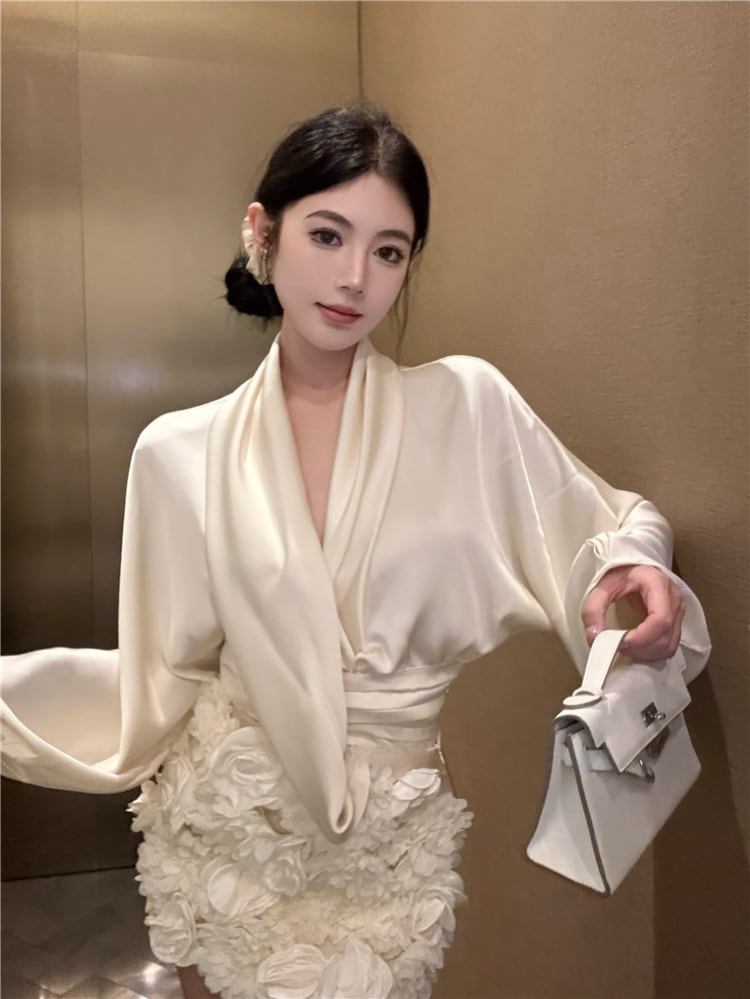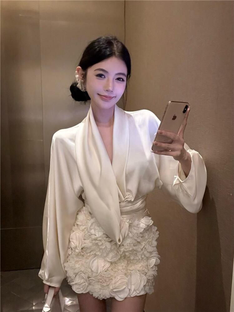【set】サテンブラウス×立体感フラワーモチーフスカートセット N2941