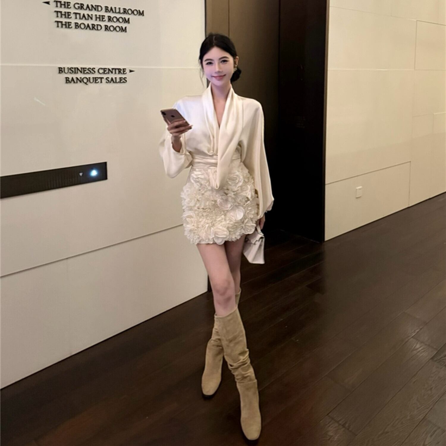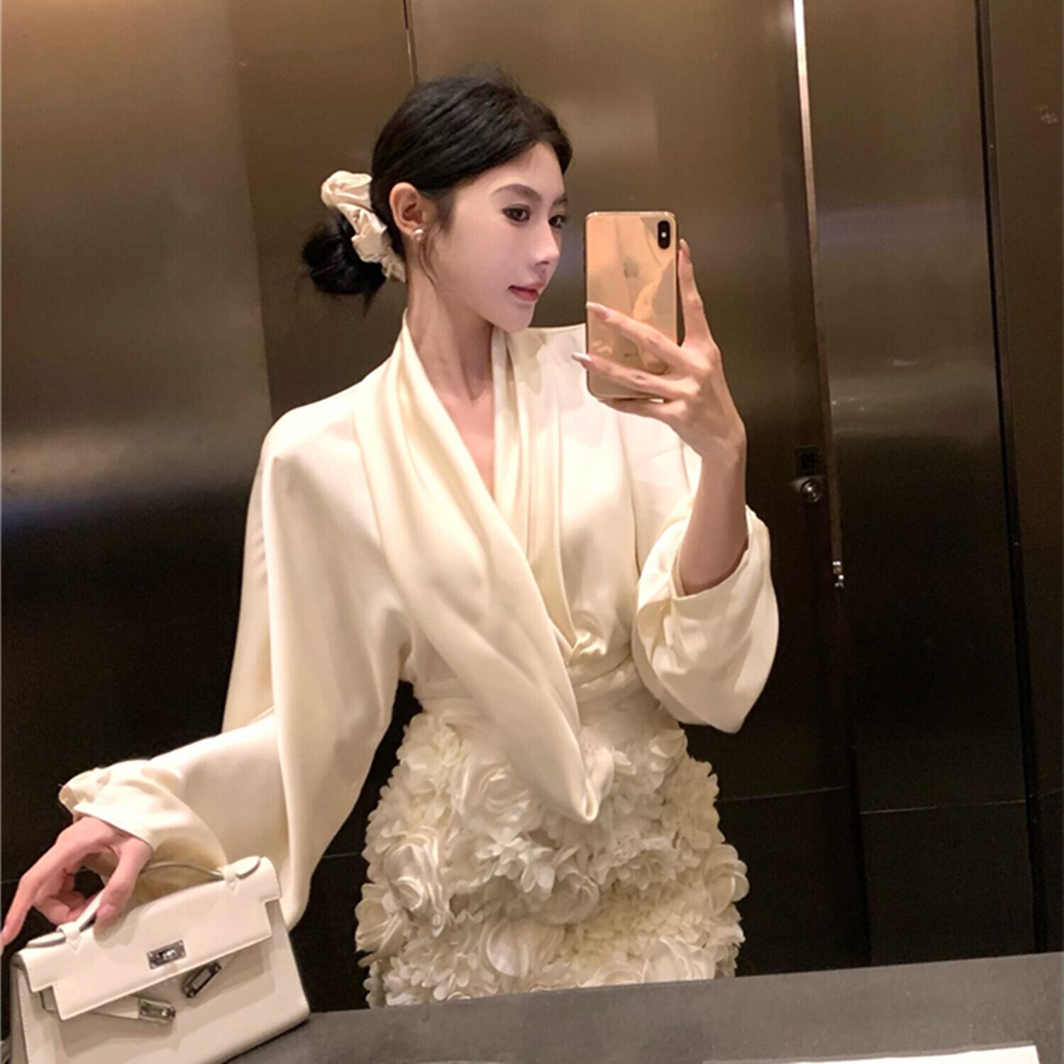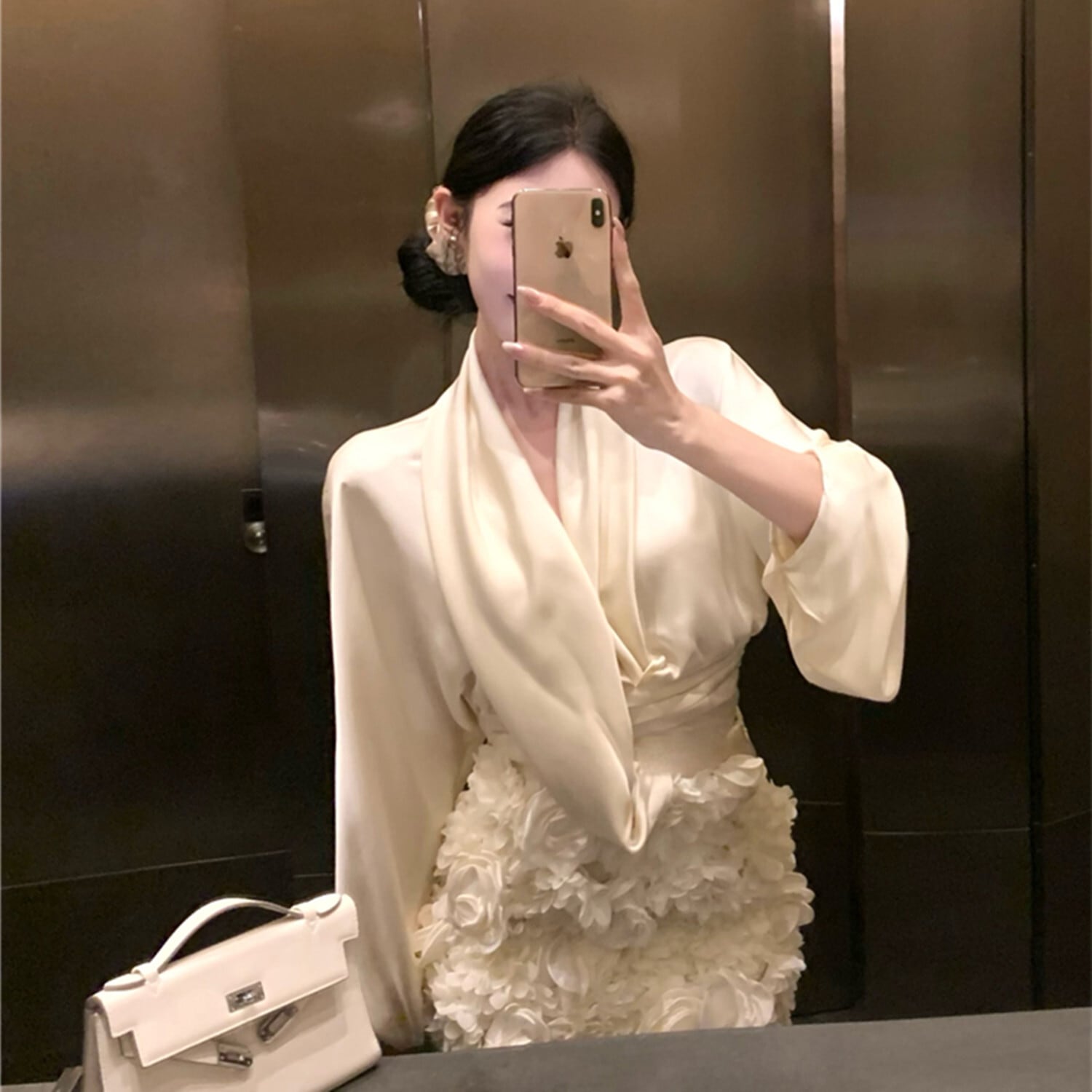 【set】サテンブラウス×立体感フラワーモチーフスカートセット N2941