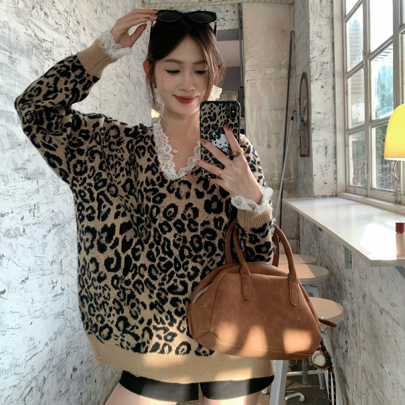 【tops】レース切り替えヒョウ柄ニットセーター M28897