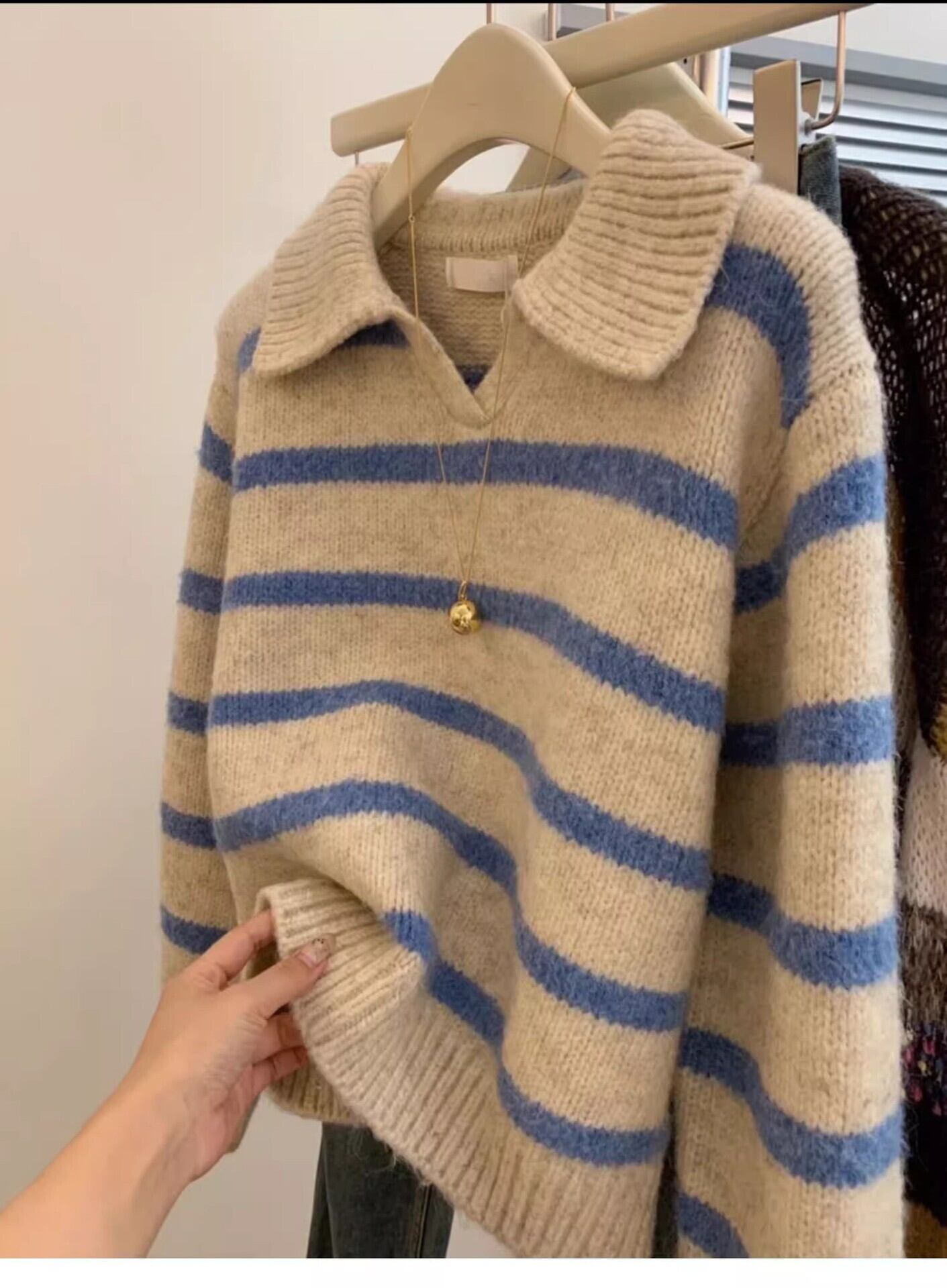 【tops】POLOネックボーダー柄ニットセーター M28989