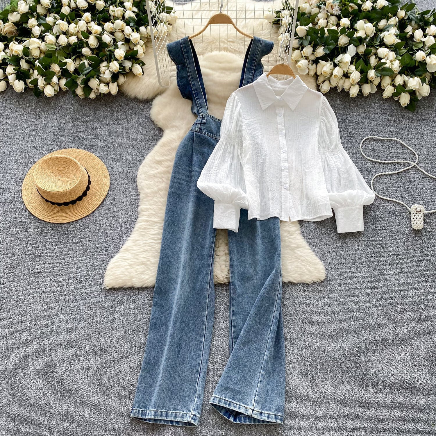 【set】シャツトップス×サロペットデニムパンツセット M29710